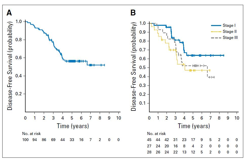 IMPACT研究与ADJUVANT研究几乎完全一致,共计232例患者纳入分析,IMPACT研究未能发现DFS获益,两组中位DFS分别为35.9个月和25.1个月,HR=0.92,P=0.63。OS同样未能展示获益,生存曲线未出现显著分开的趋势,HR=1.03,5年OS率分别为78%和74.6%。亚组分析中,II期和III期的患者,DFS的HR值分别为0.967和0.966,OS的HR值分别为0.954和1.094。