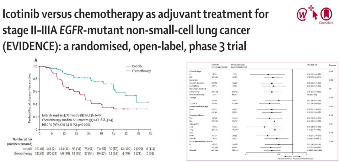 其实,在ADJUVANT研究的首次数据公布时,两条生存曲线在36个月的时候已经开始出现了融合的趋势,而两组DFS约10.0个月的差异也恰恰是晚期患者接受一代EGFR-TKI的中位PFS数据,因此,ADJUVANT研究DFS的获益转化为OS的获益并不是一个大概率事件,而后续更新的OS数据也印证的这种猜测;虽然EVAN研究两条生存曲线分开明显,未见到明显融合的趋势,其HR=0.268也是一个非常漂亮的数据,但需要注意的是,该研究在进行设计的时候,α=0.2,对于一项确认性研究,显然,这样的标准过于宽松,此外,EVAN研究的主要研究终点是2年DFS率,而不是中位DFS,在这种情况下,两组的中位DFS只能是探索性数据。在DFS是主要研究终点,是确证性数据的情况下,学术界都存在争议,更何况只是探索性质的DFS数据。