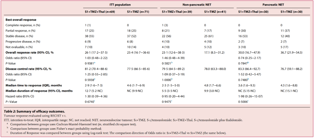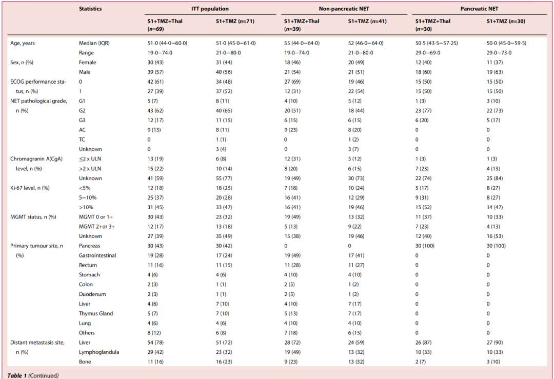 人口统计学和基线特征如下表(表1)所示,两组间基本维持平衡。S1+TMZ+Thal组和S1+TMZ组中,分别有15%和17%为G3 NETs,45%和47%为Ki-67>10%,17%和18%为MGMT 2+或3+,57%和58%原发灶为非胰腺,78%和72%存在肝转移,20%和34%既往接受过全身治疗。