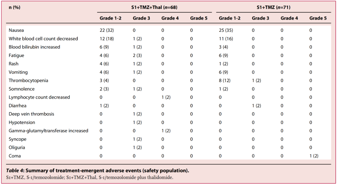 S1+TMZ+Thal组最常见的AE是恶心(32%)、白细胞减少(18%)、血胆红素水平升高(9%)和乏力(6%)等;3-4级AE的发生率为9%(6/68),包括疲劳、白细胞减少、血胆红素水平升高和呕吐等;没有发生5级不良事件。S1+TMZ组最常见的AE是恶心(35%)、白细胞减少(16%)、血小板减少(12%)和乏力(9%)等,3-5级AE的发生率为4%(3/71),包括血小板减少症、腹泻各1例,昏迷1例(与治疗无关)。
