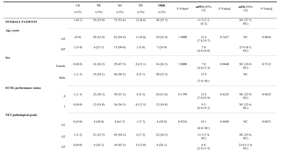 此外,年龄<65岁患者相较于≥65岁患者的OS更长(NC vs 25.6个月,P=0.0018);胰腺NET患者相较于非胰腺NET患者的PFS更长(NC vs 7.4个月,P=0.0003)。