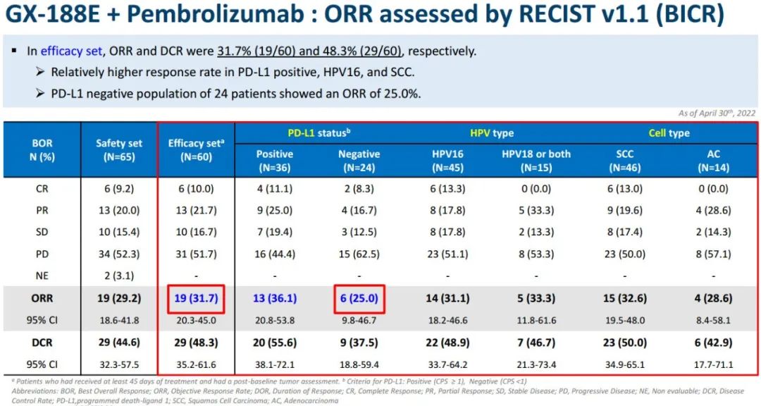 GX-188E是一种治疗性DNA疫苗。2022 ESMO发布的这项韩国试验在HPV 16或HPV 18阳性晚期宫颈癌患者中评估了GX-188E联合PD-1抑制剂帕博利珠单抗的方案,获得31.7%的最佳总体缓解率,安全性可控。联合方案有一定疗效,但数据并不突出。