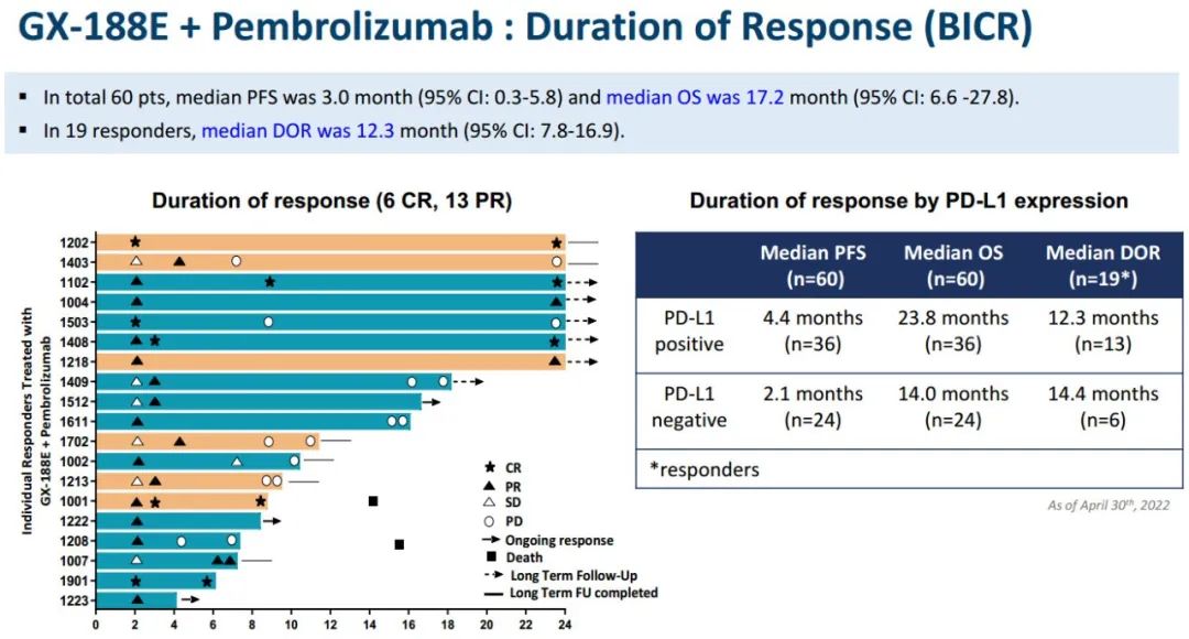 S.Lee,et al.Efficacy and safety of GX-188E,a therapeutic DNA vaccine,combined with pembrolizumab in HPV 16-and/or 18-positive advanced cervical cancer(phase II):Safe and effective in both PD-L1 positive and negative.Presented at:ESMO Congress;September 9-13,2022.Paris,France and virtual.Abstract LBA32.