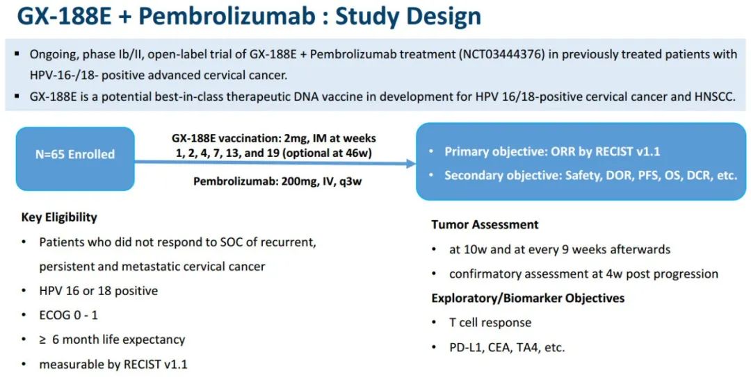 患者在第1、2、4、7、13、19周肌肉注射2mg GX-188E,以及在第46周选择性注射GX-188E;同时每3周静脉注射帕博利珠单抗200mg,持续两年或直至疾病进展。主要研究终点为由盲态独立评审委员会(BICR)根据RECIST v1.1标准评估的ORR。次要终点为安全性、缓解持续时间(DOR)、无进展生存(PFS)、总生存(OS)和疾病控制率(DCR)等。