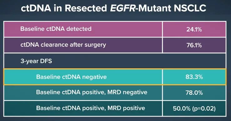 基线ctDNA阳性或MRD阳性与根治性切除的IA-IIIA期EGFR阳性NSCLC患者DFS较差相关(#933MO)