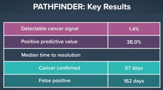 PATHFINDER的主要研究终点是测量使用多癌种早期检测(MCED)血液测试检测到癌症信号后实现“诊断解决”(即医疗服务提供者定义的诊断评估结束)所需的时间以及过程中使用的诊断测试数量和类型,次要终点是MCED检测效能。研究共纳入6600多例50岁及以上的患者(该年龄段人群属于患癌高风险人群),他们在一次血液测试后接受了癌症筛查。尽管该研究在1.4%的受试者中发现了癌症,但较低的阳性预测值(38.0%)使这种检测方法的广泛应用受到质疑(摘要#903O)。