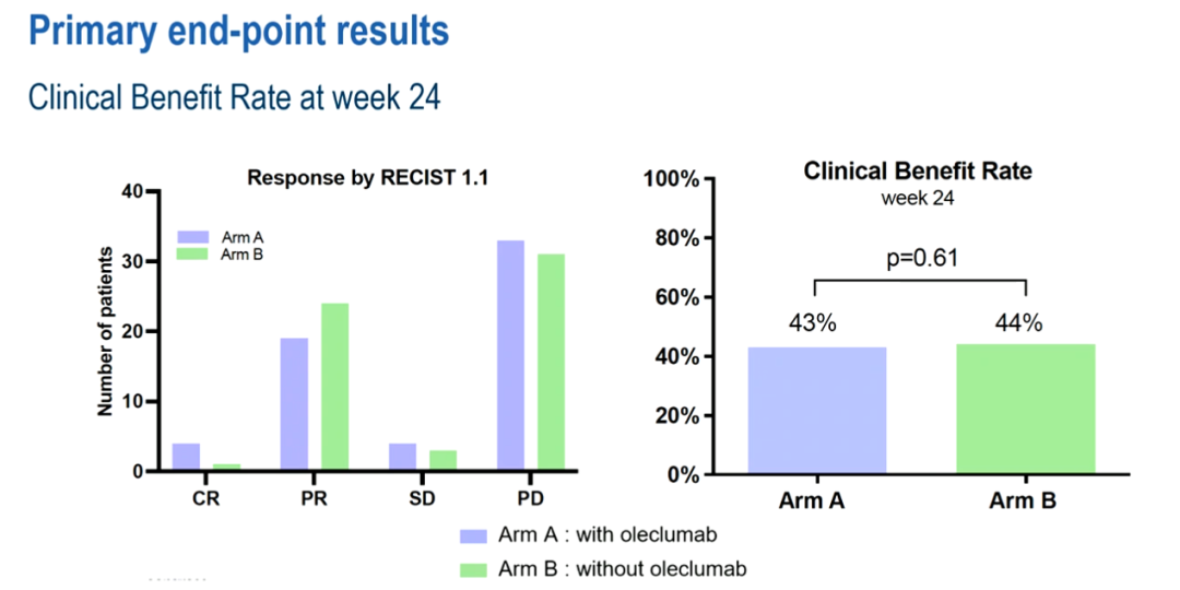 试验没有显示出两组之间的临床获益率差异,主要研究终点显示,A组采用双重免疫疗法的临床获益率为43%,B组单用Durvalumab的临床获益率为44%。