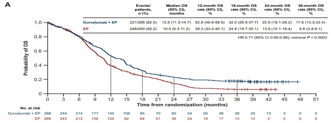 同时,既往有学者探索了新型第三代化疗药物培美曲赛与依托泊苷的头对头比较,结果发现两组中位PFS分别为3.8个月和5.4个月,两组中位OS分别为8.1个月和10.6个月,培美曲赛虽然在腺癌患者一线治疗中具有重要地位,但在小细胞肺癌患者中,其疗效劣于依托泊苷,因此,依托泊苷联合铂类所组成的双药治疗的标准治疗地位未能撼动。