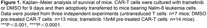 为了探索MEK抑制剂是否可以减轻抗原非依赖性CAR强直信号(tonic signaling)传导的不利影响,我们将CD19.28z CAR-T细胞分别在含MEK抑制剂曲美替尼(trametinib)、考比替尼(cobimetinib)和比美替尼(binimetinib)的培养基中培养9天,以上3种MEK抑制剂均已经FDA批准用于临床,所用浓度分别为它们血药浓度的峰值。我们发现这3种MEK抑制剂都可以减少CAR-T细胞的终末分化,抑制耗竭和激活标志物的表达。其中,曲美替尼是最有效的,因为它可以在最低浓度下达到与考比替尼和比美替尼相当的效果。因此,我们选择曲美替尼进行进一步研究。我们证实,与7.5nM和30nM相比,15nM是曲美替尼的最佳浓度,在该浓度下曲美替尼对CAR-T细胞的表型有很强的影响,而对CAR-T细胞的增殖仅有轻微抑制作用。曲美替尼预处理不影响CD19.28z CAR-T细胞的体外细胞毒性。随着治疗时间的延长和剂量的增加,曲美替尼的上述作用更为显著。为了确定MEK抑制剂是否对使用其他scFv和共刺激结构域的CAR-T也起上述作用,我们将曲美替尼分别加入CD19.4-1BBz和GD2.28z CAR-T细胞的培养基中,也取得了类似的结果。有趣的是,因为GD2.28z CAR-T更容易耗竭,在含曲美替尼的培养基中培养的GD2.28z CAR-T细胞具有更好的增殖和杀伤能力。在体内实验中,我们发现与DMSO预处理的CD19.28z CAR-T细胞相比,曲美替尼预处理的CD19.28z CAR-T细胞具有更强的抗白血病活性,耗竭和分化程度更低,增殖更好,进一步延长了小鼠存活期(图1)。用CD19.4-1BBz CAR-T细胞进行体内实验可获得相似的结果。为了评估曲美替尼是否可以保护CAR-T细胞免受抗原刺激引发的耗竭和终末分化,我们将CD19.28z CAR-T细胞与Nalm-6细胞在含有或不含有曲美替尼的培养基中共培养。我们证明在抗原刺激下,曲美替尼可有效抑制CAR-T细胞的活化、耗竭、凋亡、终末分化和ERK磷酸化,从而促进总CAR-T和CD8 CAR-T细胞的增殖。此外,在重复抗原刺激后,曲美替尼可以挽救CAR-T细胞的功能衰竭,提高CAR-T细胞的体外细胞毒性。