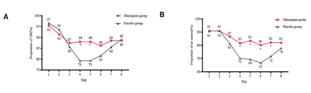 张力教授团队开展的这项双盲双模拟、随机对照、III期临床研究专门针对于接受高致吐药物多日化疗的患者,研究入组了349例计划接受含3天含顺铂(3天总剂量≥75mg/m2)化疗方案的恶性实体肿瘤患者,1∶1随机分组,分别接受口服奥氮平或安慰剂联合三联止吐疗法(包括福沙匹坦、昂丹司琼和地塞米松)。结果显示:奥氮平组在整个观察期达到完全缓解的患者比例显著高于安慰剂组(69%vs.58%,P=0.031)。整个观察期,奥氮平组中未发生恶心的患者多于安慰剂组(72%vs.60%,P=0.021)。