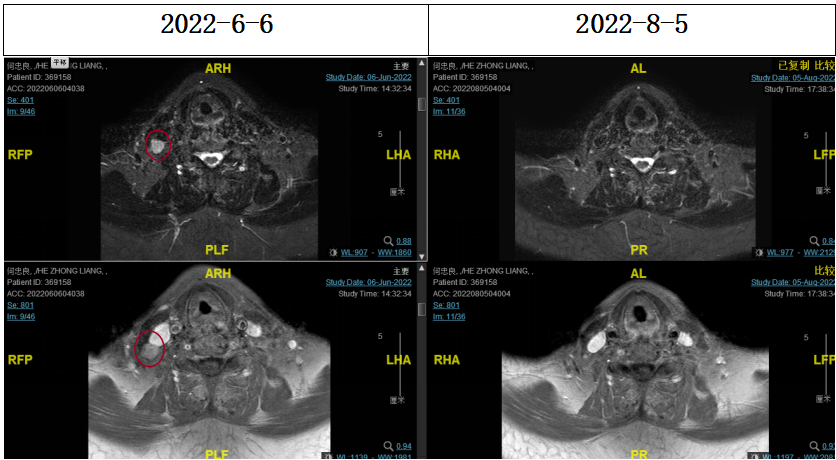 2022-08-05(放疗近结束)复查MR,疗效评价:CR。鼻咽部肿物及咽后转移淋巴结颈部转移淋巴结均达到CR。