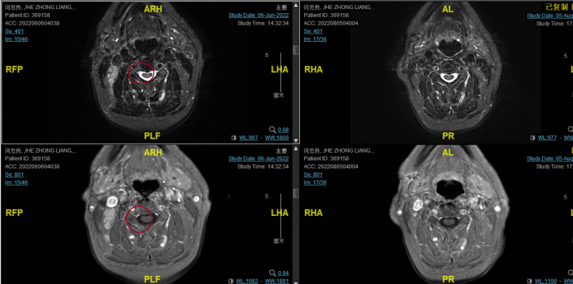 2022-05-05鼻咽部增强CT示:鼻咽CA并左侧翼腭弓、海绵窦受侵,伴邻近蝶窦、左侧筛窦、枕骨斜坡、左侧框下裂骨质破坏;右侧颈部多发肿大淋巴结(最大2.4×1.4cm),考虑转移;2.双侧梨状窝闭塞。