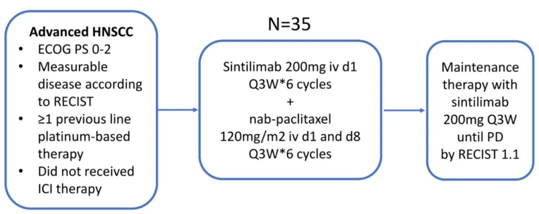 本研究为单臂、开放标签、单中心Ⅱ期临床研究,纳入铂类治疗失败的复发性/转移性HNSCC患者。所有患者均接受信迪利单抗(200 mg iv d1)和白蛋白结合型紫杉醇(120 mg/m2 iv d1和d8)治疗,每3周为一个周期,直至治疗6个周期,然后信迪利单抗维持治疗直至疾病进展、死亡或剂量限制性毒性。主要终点为客观缓解率(ORR)。次要终点包括无进展生存(PFS)、总生存(OS)和安全性。研究设计见图1。