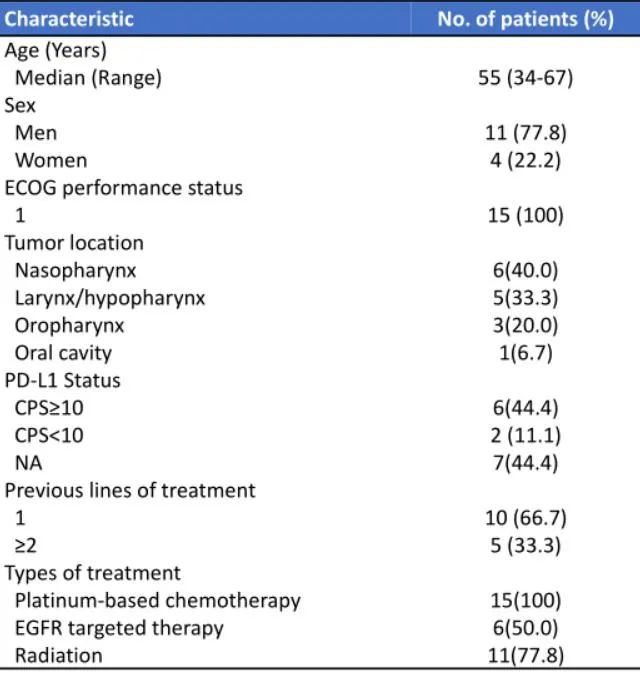 从2019年4月到2022年4月,15例患者被纳入研究,患者的基线特征见表1。中位年龄为55岁(34~67岁),11例为男性。肿瘤原发部位包括口咽(1,6.7%)、鼻咽(6,40.0%)、喉/下咽(5,33.3%)和口腔(3,20.0%)。11例(73.3%)患者存在远处转移;15例(100%)均既往接受铂基化疗,11例(73.3%)患者接受过放疗、6例(40.0%)接受过EGFR靶向治疗;15例(100%)患者的ECOG PS为1;6例(40.0%)PD-L1 CPS≥10,7例(40.0%)NA。患者的肿瘤大小自基线的变化见图2。