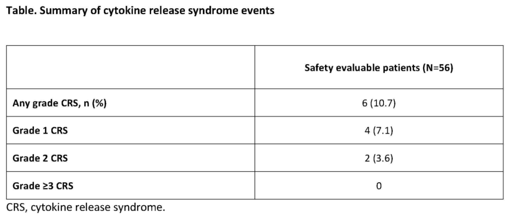 无患者发生3-5级CRS事件,6例(10.7%)发生1-2-级CRS:1级,n=4;2级,n=2。所有CRS事件都发生在C2-3期间,可缓解。22例(39.3%)患者发生神经AEs(NAEs)(多数≤2级[20/22]),3级NAEs包括脑血管意外(n=1)和带状疱疹(n=2)。无glofitamab相关NAEs与免疫效应细胞相关神经毒性综合征可能相关。27例(48.2%)患者发生中性粒细胞减少(3级,n=6;4级,n=19),严重感染9例(16.1%)。
