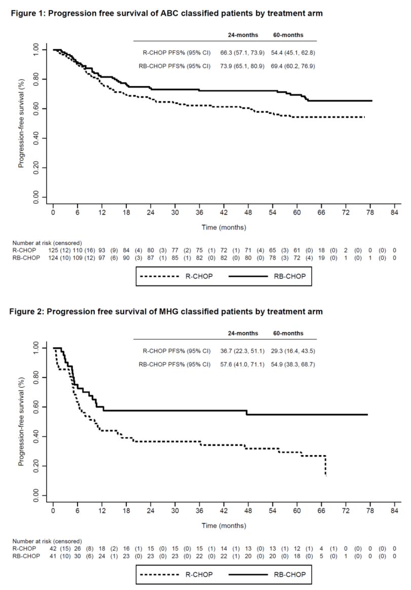 REMoDL-B是一项开放式随机3期适应性研究,患者来自英国和瑞士。纳入条件包括初治,组织学证实为DLBCL I-IV期,>18岁,ECOG PS≤2,心脏、肺、肾和肝功能足以耐受全剂量化疗。初始活检标本足够进行GEP分析的患者随机分入R-CHOP和RB-CHOP组,分层因素包括国际预后指数(IPI)和COO。随机时采用DLBCL自动分类器对COO分类,回顾性重新评估时加用MHG分类器。使用Kaplan-Meier方法和cox回归模型进行事件时间分析。REMoDL-B研究与南安普敦临床研究部协作,由Janssen Cilag资助,经独立同行评审(C328/A12128)后由英国癌症研究所批准。