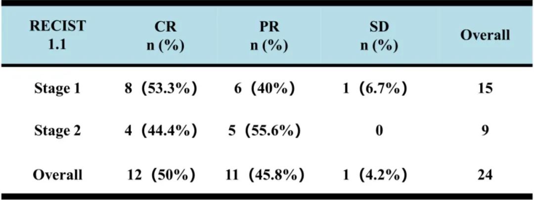 所评估患者的缓解情况见表2。12例(50%)患者在新辅助治疗后达到CR。