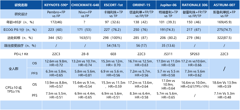 除上述研究外,在食管癌一线免疫治疗领域,目前已有7个免疫治疗的III期研究取得阳性结果,如信迪利单抗的ORIENT-15研究11、卡瑞利珠单抗的ESCORT-1ST研究12。下图将该7项研究的基线、研究设计及主要结果予以陈述,以飨读者。