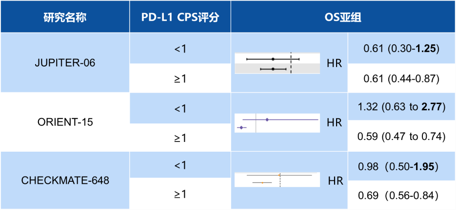 然而临床面临的现状是复杂的,一项对JUPITER-06等研究的事后分析研究显示,一线免疫治疗中,TPS评分<1%、CPS<10的患者亦能通过免疫治疗带来获益14。由此可见,对于PD-L1阳性的判断中应选择TPS评分还是CPS评分,目前临床多认可CPS评分,但其cutoff值为1分还是10分尚无定论,临床医生不能忽略低评分患者获益的可能性,如ASTRUM-007研究提示,免疫联合化疗显著延长全人群(PD-L1 CPS≥1)的PFS和OS。结合诸多前期临床研究表现(见下图),也许CPS≥1作为cutoff值更合适,能够使更多的患者从免疫治疗中获益。在食管癌的精准治疗方面,选择合适的生物标志物,挑选出免疫治疗的优势获益人群,未来还需要更多的探索。