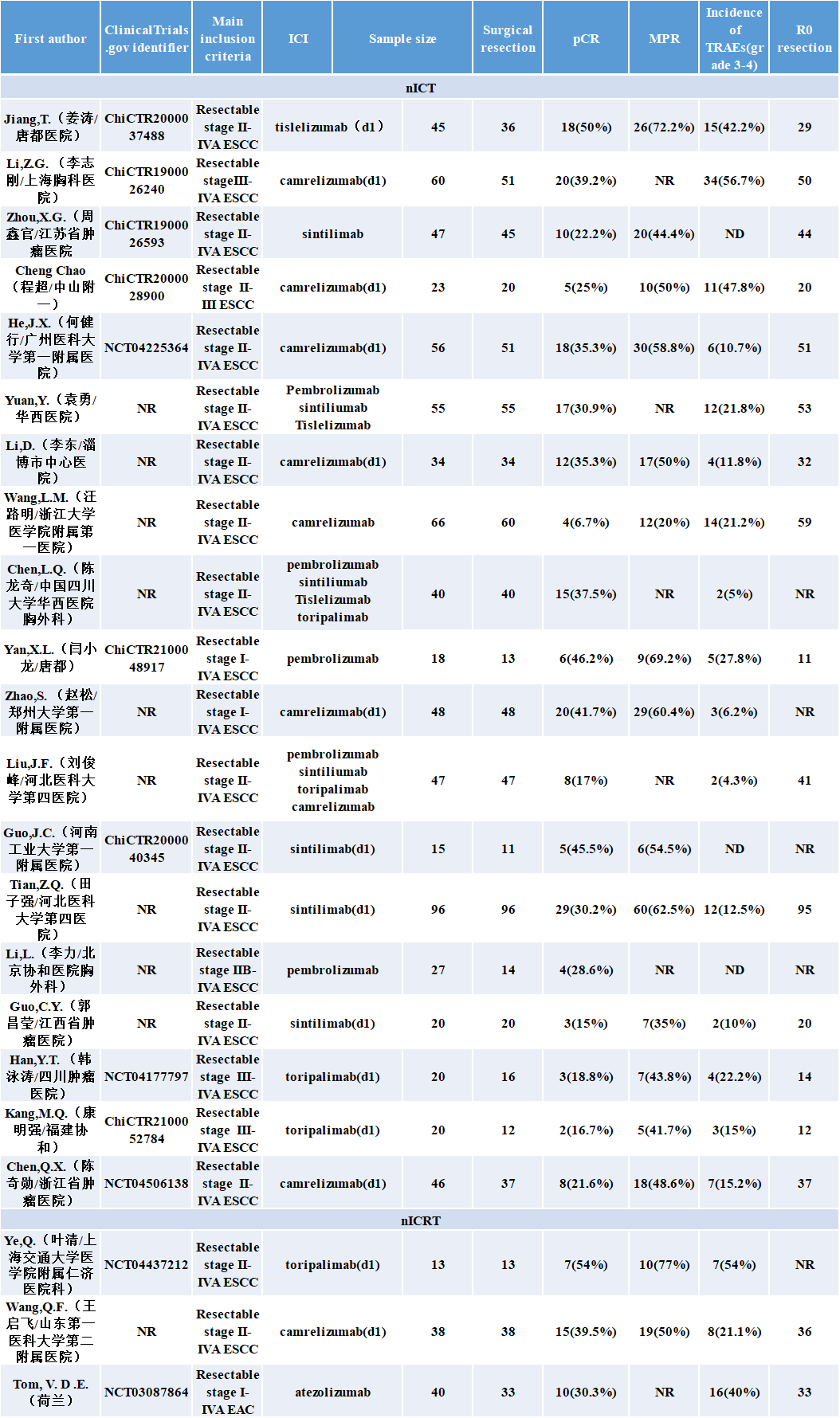 唐都医院胸外科闫小龙教授开展的一项免疫联合放化疗新辅助治疗食管癌的Meta分析显示术后pCR介于7.7%-55.6%,均高于新辅助化疗。亚组分析显示,新辅助免疫联合化疗(nICT)组疗效与免疫联合同步放化疗(nICRT)组相似,pCR为33.8%vs39.8%,MPR为53.5%vs88.8%,而3-4级不良反应更低17。但近期课题组结合新发表的文章再次进行更新数据显示,nICT与nICRT的pCR率为30.6%vs42.5%,MPR为51.5%v72.5%,3-4级不良反应为16.7%vs42.9%,提示nICRT组虽然合并不良反应更多,但效果可能更好。