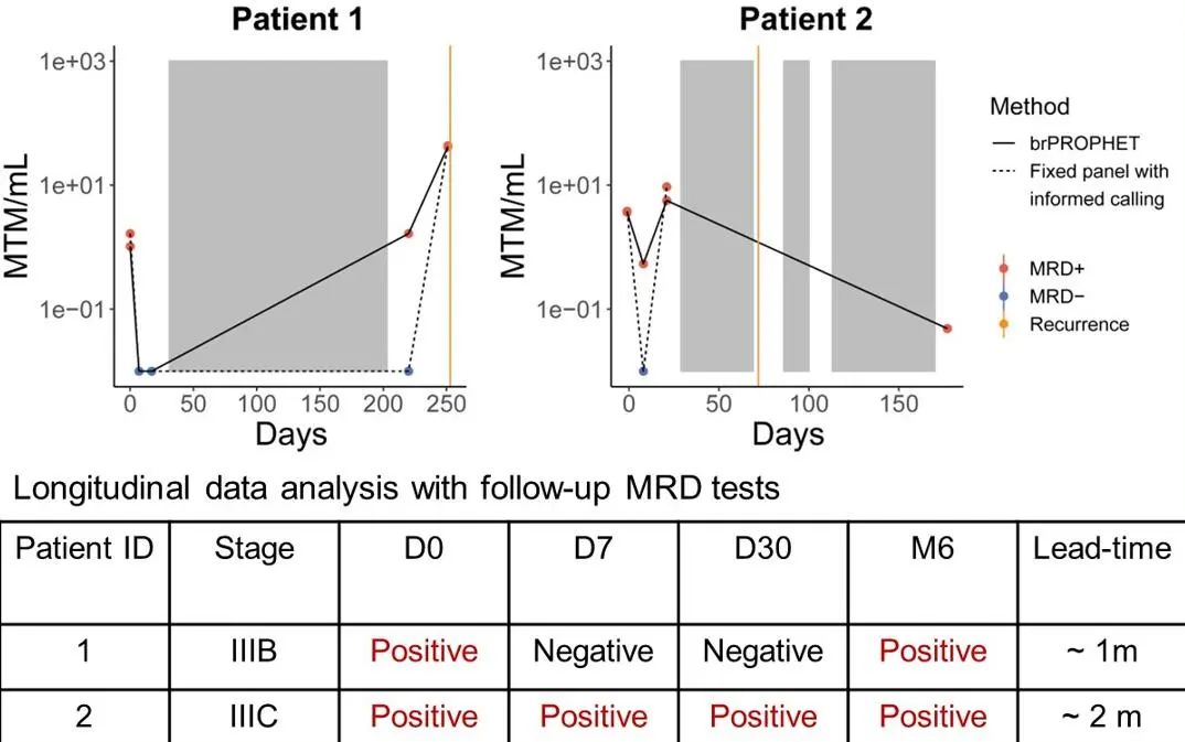 这项研究报道了患者特异性brPROPHET在肠癌患者ctDNA检测中的临床性能,在检测术前和术后ctDNA方面表现出优于固定面板检测法的敏感性。该研究后续监测正在进行,其与临床结果的相关性结果有待揭晓。