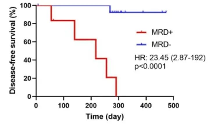 图4.动态监测MRD阳性与更短的DFS显著相关