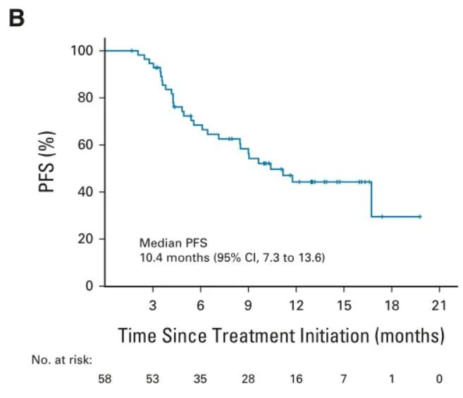 中位PFS为10.4个月(95%CI:7.2~13.6)(图3),12个月时的PFS率为44.3%(95%CI:29.5~58.6)。