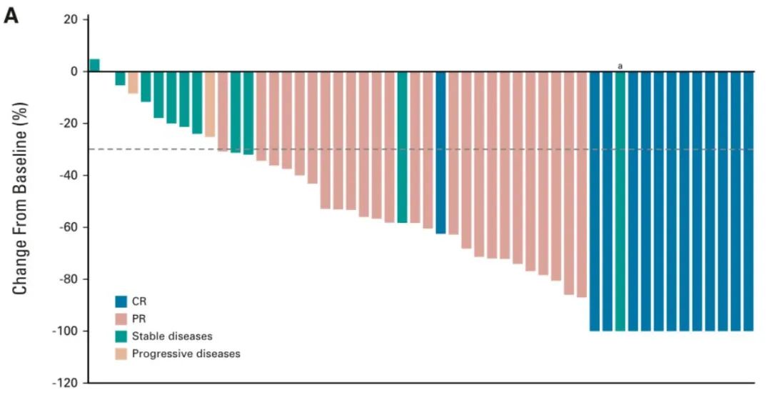 中位随访12.4个月,在52例可评估患者中,确认的总缓解率为65.5%(38例),其中13例达到完全缓解(CR率,22.4%),25例达到部分缓解(PR率,43.1%)[1]。