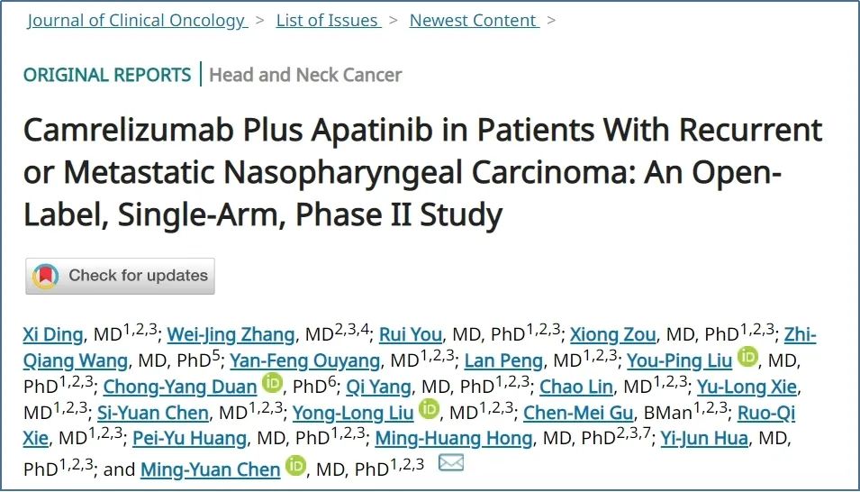 近期,中山大学肿瘤防治中心陈明远教授团队在国际顶级肿瘤学杂志Journal of Clinical Oncology(JCO;2022年IF:50.717)在线发表研究论文,根据单臂Ⅱ期试验(NCT04586088)的结果,卡瑞利珠单抗联合阿帕替尼在复发性或转移性鼻咽癌患者中具有长期抗肿瘤活性,毒性可控。