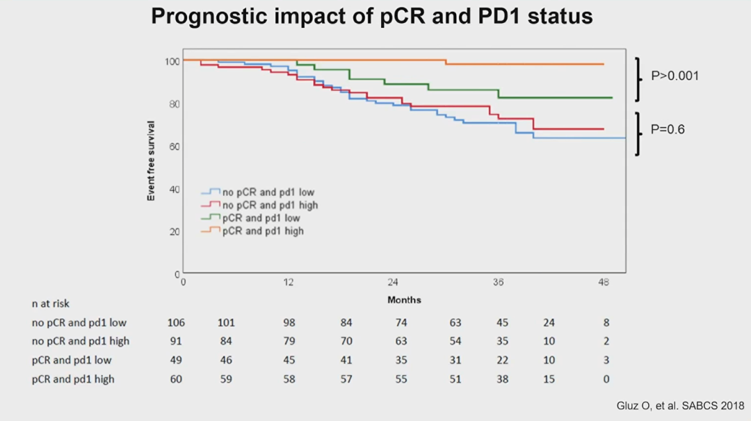 ADAPT-TN试验纳入了336例早期TNBC患者,新辅助治疗方案为12周白蛋白紫杉醇联合吉西他滨,或白蛋白紫杉醇联合卡铂,术后继续使用4周期表阿霉素联合环磷酰胺辅助化疗。SABCS 2018公布的数据表明,在达到pCR的患者中,辅助化疗并未改善患者的iDFS;因此提出对于这部分患者不应继续给予化疗。并且该研究的探索性分析发现,相对于PD-1表达较低的患者,PD-1表达较高者具有更好的生存结局。未来可根据pCR或其他肿瘤分子特征(例如PD-1)选择治疗方案,使患者预后更佳。