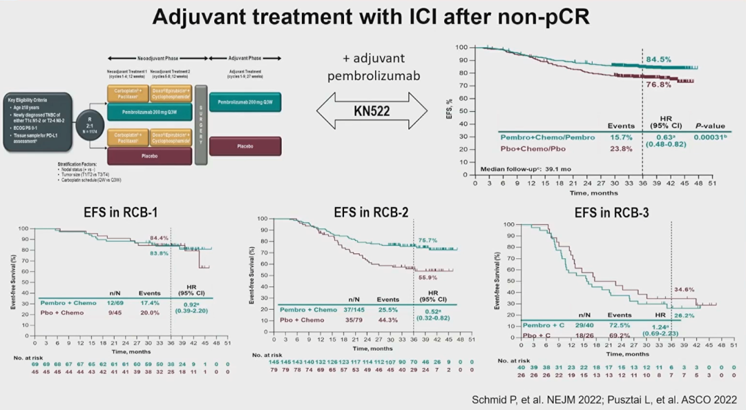 KN522研究表明,non-pCR患者应用pembrolizumab辅助治疗可改善生存,不同RCB亚组的获益提示,或可在特定人群中进行升阶治疗。