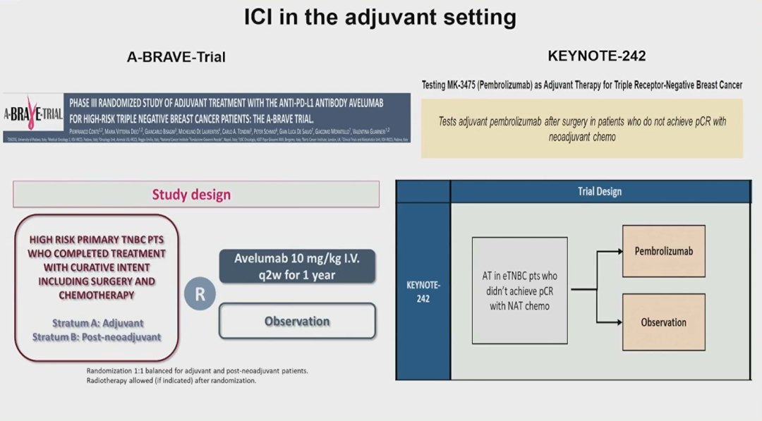 在新辅助化疗的基础上联合ICI是早期TNBC的有效策略,但目前尚不清楚ICI的最佳治疗持续时间。KN522研究,在紫衫/蒽环/铂类化疗基础上加入pembrolizumab并在辅助治疗阶段继续应用pembrolizumab一年,显著提高了pCR及EFS;GeparNUEVO研究,仅在新辅助治疗阶段联合durvalumab使pCR率有一定程度增加并改善了患者生存。KN522中的pCR患者两组获益相似,但在GeparNUEVO研究中并非所有pCR患者生存一致,联合durvalumab组的3年iDFS优于对照组(95.5%vs.86.1%)。那么通过加入pembrolizumab而达到的pCR是否与未使用pembrolizumab一致?如果后续不再继续使用pembrolizumab,生存结局又将如何?目前还无法回答这些问题,仍需更多的试验数据,但讲者认为pCR患者应继续使用pembrolizumab。