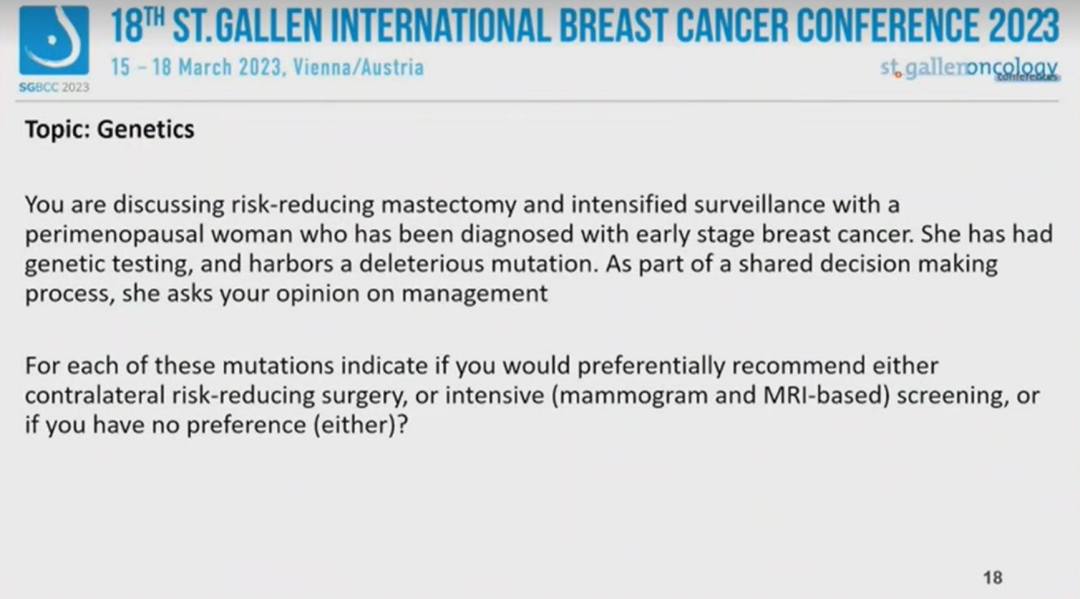 第18届St.Gallen国际乳腺癌大会(SGBCC 2023)于当地时间2023年3月15~18日在“世界音乐之都”维也纳举行。SGBCC汇聚全球各地的乳腺癌意见领袖,围绕最前沿、最具争议的早期乳腺癌诊治话题,展开讨论和投票,形成每两年一更新的St.Gallen早期乳腺癌国际专家共识。《肿瘤瞭望》整理了早期乳腺癌的病理、基因、DCIS、男性相关专题的专家投票,一起感受早期乳腺癌治疗决策的圣加仑氛围。