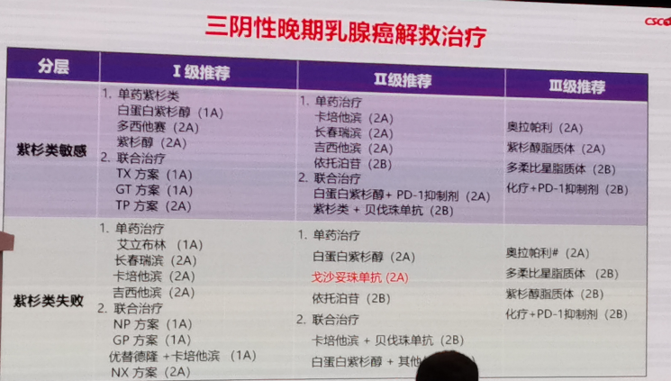 2023版CSCO BC指南三阴性晚期乳腺癌解救治疗的更新不多,主要是优替德隆+卡培他滨的证据级别调整。虽然化疗仍是三阴性晚期乳腺癌最常用的基本治疗手段;但一些靶向治疗药物对于部分具有特定靶点的三阴性晚期乳腺癌患者取得了精准突破;免疫治疗已经进入三阴性晚期乳腺癌的临床实践,PD-L1阳性的一线治疗患者是其优选人群;ADC类药物已进入三阴性晚期乳腺癌的临床实践且具有值得期待的广阔应用前景。