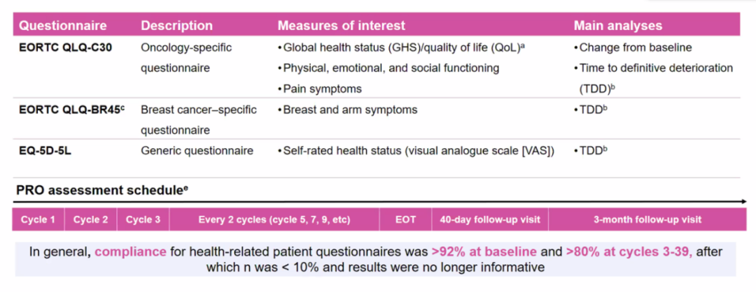 另外,患者报告结局(PRO)在化疗期间、化疗结束以及化疗后进行评估。患者在问卷调查中的依从率极高,在基线时超过92%,且在第3和39个治疗周期时还维持在80%以上。不过患者数量过少,削弱了结果的参考价值。