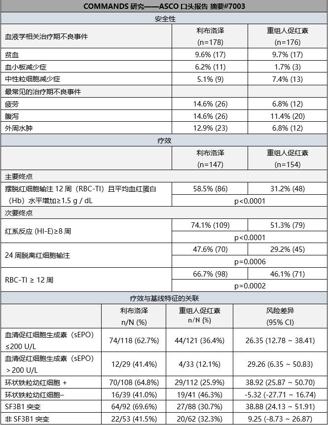 3期COMMANDS研究结果将在美国临床肿瘤学会(ASCO)年会的官方新闻发布会上对外发布。结果显示,罗特西普组(包括所有临床相关亚组)实现摆脱红细胞输注且血红蛋白水平提高的患者比例是重组人促红素组的近两倍