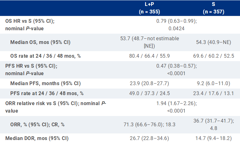 近年来,晚期肾癌一线治疗迎来了靶免治疗“群雄逐鹿”的时代,包括“可乐组合”(仑伐替尼+帕博利珠单抗)CLEAR研究在内的多项3期研究已经得到PFS和OS阳性结果。本次ASCO大会报道了CLEAR研究的最终OS分析(摘要号:4052[9],仑伐替尼+帕博利珠单抗(L+P)组和舒尼替尼(S)组中位随访49.8个月和49.4个月。L+P组OS获益依然得到维持(HR 0.79,95%CI:0.63~0.99,P=0.0424),而且不同MSKCC风险组的OS获益均倾向于L+P组(MSKCC低危、中危、高危组的HR分别为0.89、0.81、0.59)。PFS结果也是如此,总体人群(HR 0.47,95%CI:0.38~0.57)以及MSKCC低危(HR 0.46)、中危(HR 0.51)、高危组(HR 0.18)均有PFS获益。L+P组的ORR则相较于S组几乎翻倍(71.3%vs 36.7%),完全缓解(CR)率是S组近4倍(18.3%vs 4.8%)。L+P组接受后续治疗的比例更低(51.0%vs 68.9%),二次无进展生存期(PFS2)更长(43.3 vs 25.9个月;HR 0.63,95%CI:0.51~0.77)。L+P组和S组的≥3级TRAEs分别为74.1%和60.3%。