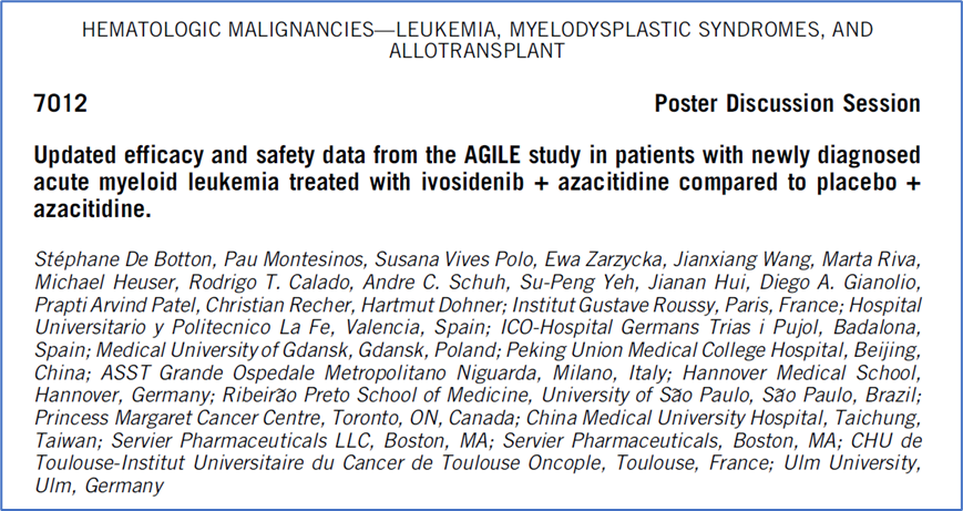 AGILE研究:艾伏尼布+阿扎胞苷vs安慰剂+阿扎胞苷治疗新诊断急性髓系白血病患者的疗效和安全性数据更新