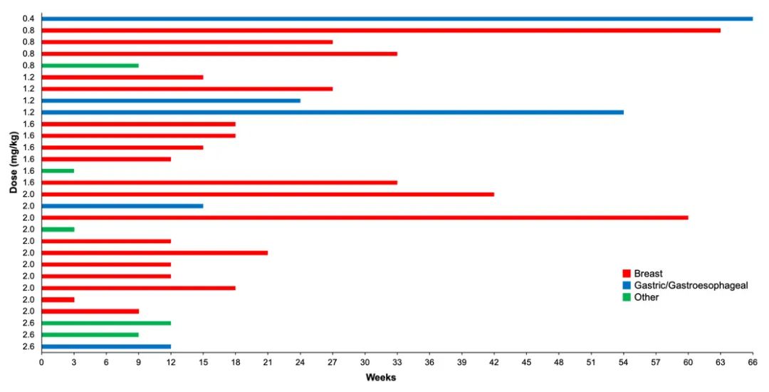 本研究纳入的5例胃癌患者均有SD。*PR在随后相隔9周的放射学评估中得到确认。治疗持续时间从3周到66周不等(图3)。