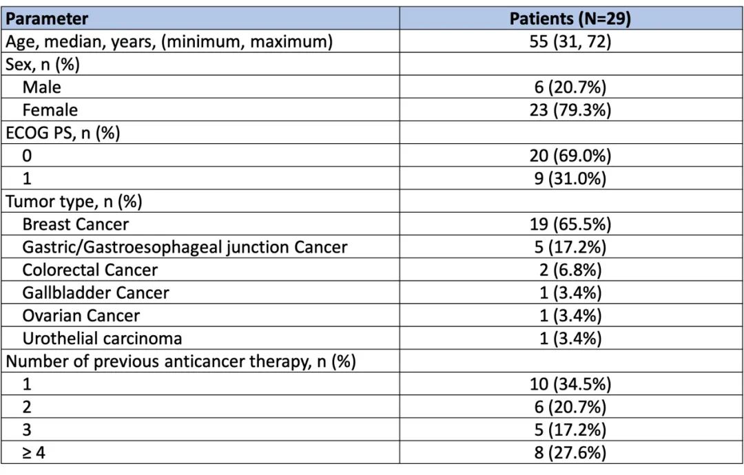 共有29名患者参加了剂量递增研究。基线患者人口统计和特征见表1。