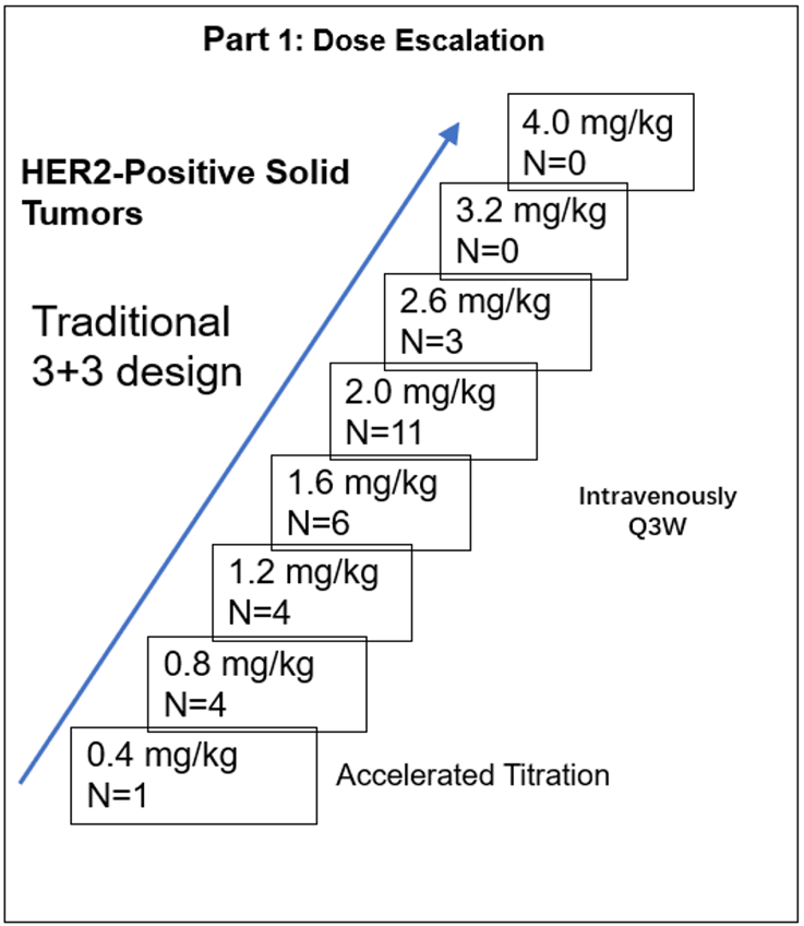 入组条件:在先前的标准治疗中进展或不耐受的晚期或转移性HER2过表达实体瘤患者。BB-1701每3周(Q3W)静脉注射1次,在第一个21天周期内评估剂量限制性毒性(DLT)。疗效终点按照实体肿瘤应答评价标准(RECIST)1.1版进行评估。起始剂量(0.4 mg/kg)比最大推荐起始剂量高82%,这是根据猴子最高非严重毒性剂量(4 mg/kg)计算的人等效剂量的六分之一。
