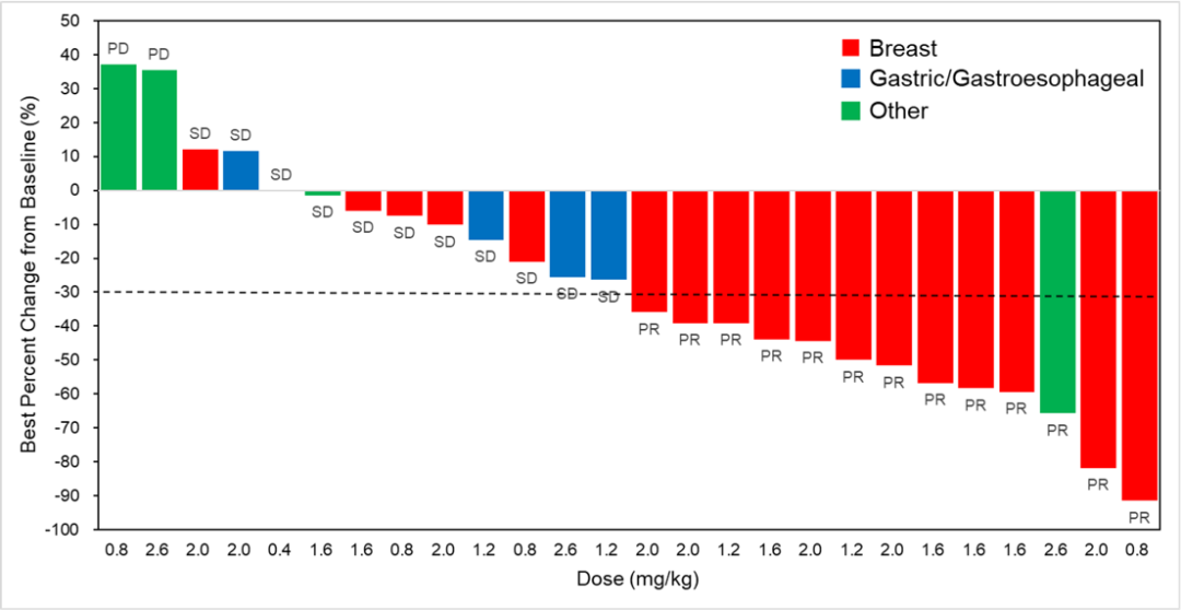 在入选的29名患者中,26名患者可评估初步抗肿瘤活性(图2)。在可评估的患者中,13例患者达到部分缓解(PR),11例患者病情稳定(SD)。