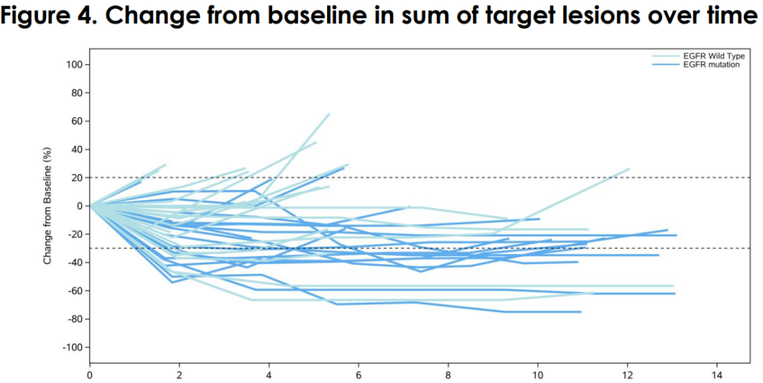 EGFR突变患者的ORR为60%(12/20),DCR为100%(20/20),mDoR为9.3个月,中位无进展生存期(mPFS)为11.1个月,12个月OS率为80.7%。EGFR野生型患者的ORR为26.3%(5/19),DCR为89.5%(17/19),mDoR为9.6个月,12个月OS率为60.6%。