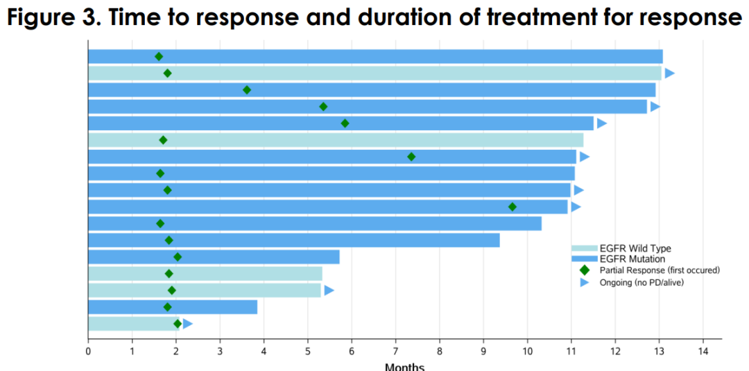 这项研究入组的43例患者中,EGFR突变型和EGFR野生型NSCLC患者各占50%左右(22例 vs 21例),其中76.7%(33/43)的患者既往接受过针对转移性疾病的2种及以上方案治疗。在EGFR突变人群中,所有患者均为EGFR-TKI耐药,50%的患者至少接受过一种化疗方案,59.1%的患者接受过第三代EGFR-TKI治疗。所有EGFR野生型患者均为抗PD-1/L1治疗失败。
