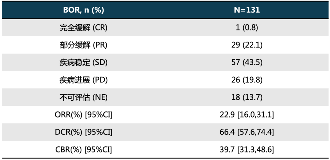 截至2022年10月30日,中位治疗时间为6个月,中位随访时间为17.74个月,研究者评估经确认的ORR为22.9%(95%CI:16.0~31.1),其中1例(0.8%)完全缓解(CR),29例(22.1%)达到部分缓解(PR),中位DoR为13.1个月(95%CI:9.4~16.6),DCR为66.4%(95%CI:57.6~74.4),CBR为39.7%(95%CI:31.3~48.6),中位PFS为7.4个月(95%CI:5.5~9.2),21个月的OS率为64.6%。