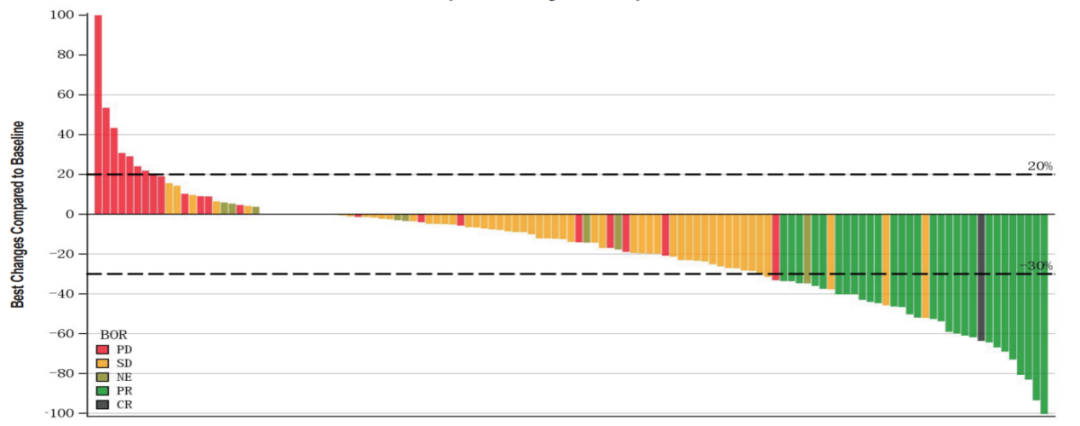 图1.根据RECIST 1.1评估的靶病灶大小较基线变化的最佳百分比