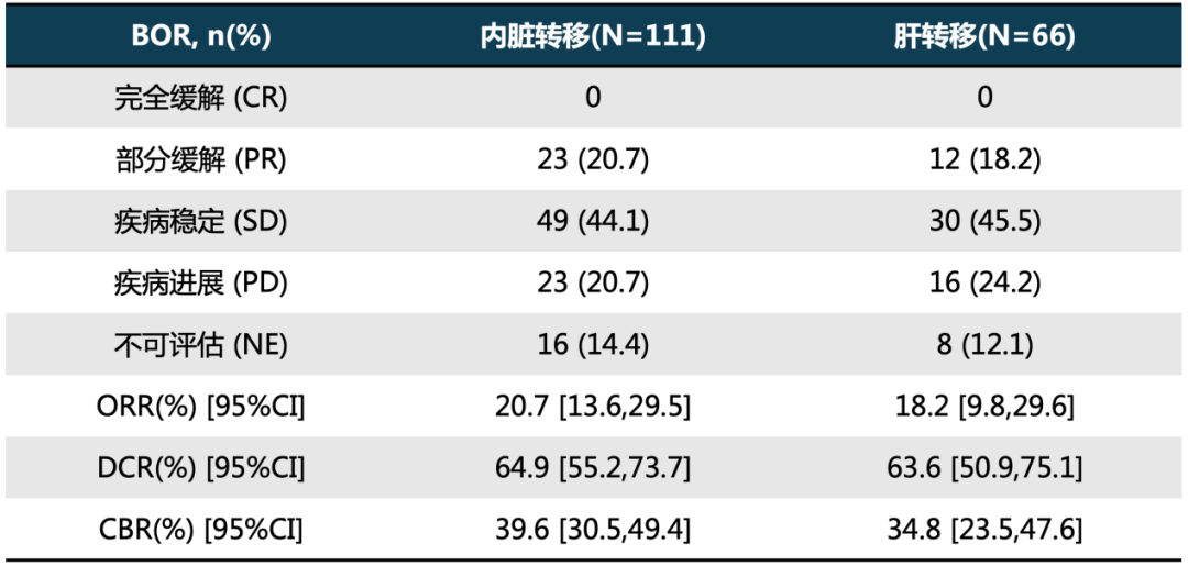 表2.合并内脏和肝转移患者的肿瘤缓解情况