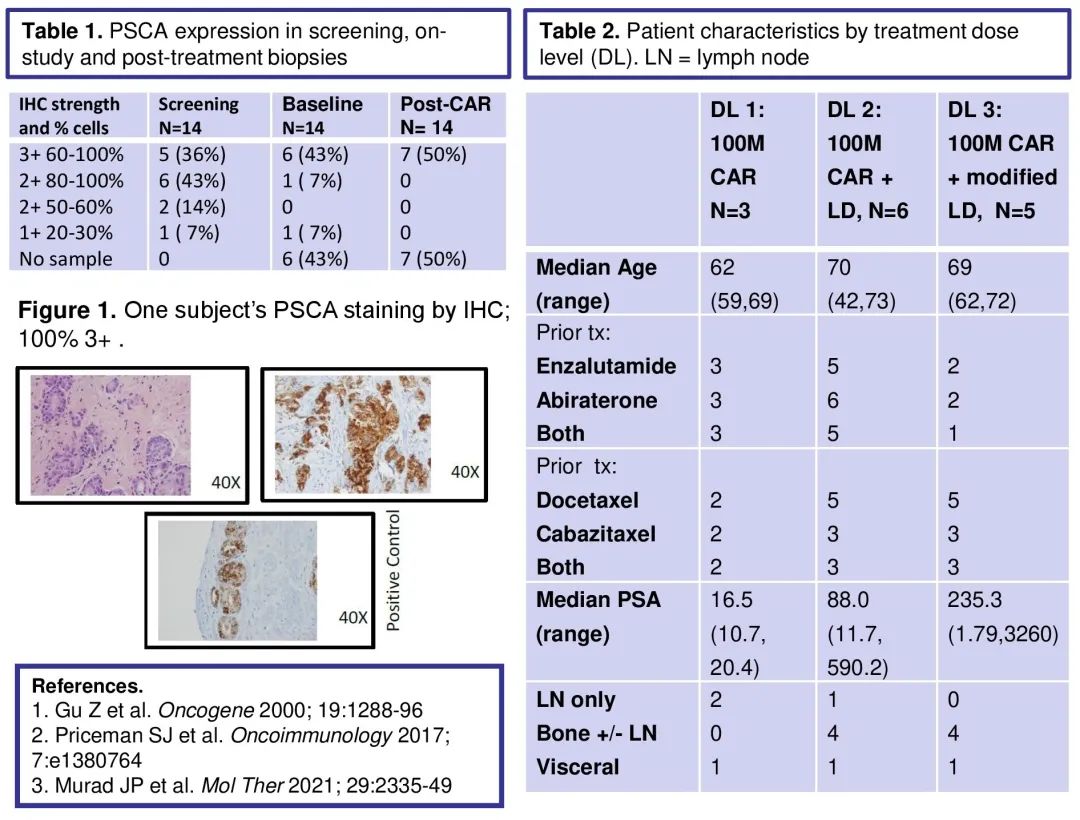 Tanya B.Dorff等人则报道采用前列腺干细胞抗原(PSCA)靶向4-1BB共刺激的CAR-T细胞疗法,用于14例至少接受过1线AR靶向治疗失败的mCRPC患者。其中有79%的患者中存在80%的肿瘤细胞PSCA表达>2+。经过改良清除淋巴细胞的化疗(环磷酰胺)剂量(n=5),患者均没有发生剂量限制性毒性(DLTs);有1例患者发生1级细胞因子释放综合征(CRS);3例患者最佳疗效为SD(RECIST),1例有PSA降低,60%(3/5)的患者CAR-T细胞扩增可持续至28天。这些结果表明,CAR-T在mCRPC患者有治疗活性,降低清淋化疗剂量可改善毒性。