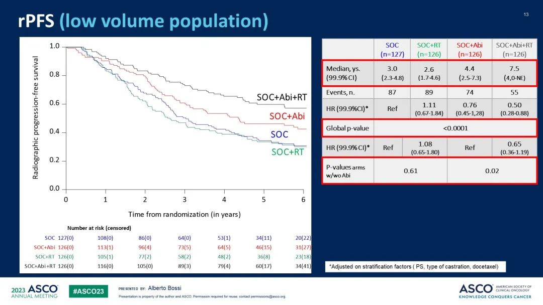PEACE-1研究纳入1172例患者中,SOC联合放疗组为584例,不联合放疗组为588例。其中505例为低容量(0-3个骨转移+/-淋巴结),252例进行放疗,253例不进行放疗。就rPFS而言,放疗和阿比特龙间存在相互作用(P=0.026),需要进行单独分析。结果表明放疗并未改善rPFS,SOC组和SOC+放疗组分别为3年和2.6年,HR=1.12(0.68-1.85)。与SOC单独比较时,SOC+AAP+RT组的rPFS存在显著改善(7.5年;HR=0.49,P<0.0001),SOC+AAP组仅改善了临界值(4.4年;HR=0.74,P=0.066)。AAP组间的HR为0.66。OS尚未达到统计交互作用的预设阈值(P=0.11)。放疗也并未改善OS:无放疗组和放疗组的中位OS分别为6.9年和7.5年(HR=0.98,P=0.86);SOC组的中位OS为7.1年,而SOC+AAP+RT组OS尚未达到。