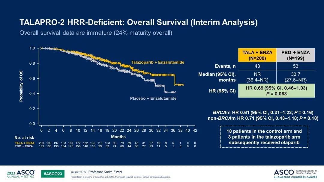 OS数据尚未成熟,TALA+ENZA组和ENZA组分别有21.5%和26.6%的死亡事件。TALA+ENZA相较于ENZA的死亡风险降低31%(HR=0.69,95%CI:0.46~1.03;P=0.068)。此外,TALA+ENZA可延缓至PSA进展、细胞毒性化疗和抗肿瘤治疗时间,并改善ORR、PSA反应和PFS2(研究者评估)。